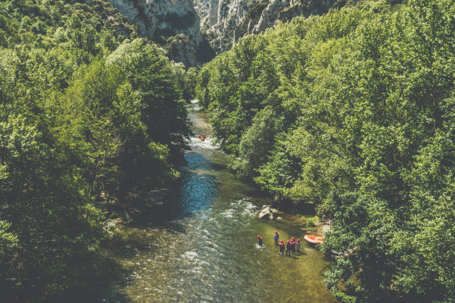 Acompañado por un guía experimentado, este recorrido de 14 km por las gargantas del Aude incluye numerosos rápidos tumultuosos. Calcule 2h30 de descenso lleno de emociones en el corazón del País Cátaro. Los más temerosos no deben preocuparse, estos botes neumáticos, con capacidad para 8 personas, son extremadamente estables y resistentes.